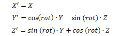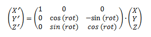 Rotates a geometry, an Angle (in radians), around the X axis. In the following table transformation matrices and equations to transform the vertices are shown.