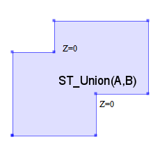 In the next example the union of two partially overlaid polygons creates two new vertex with height zero, while the preexistent ones keep their original heights.